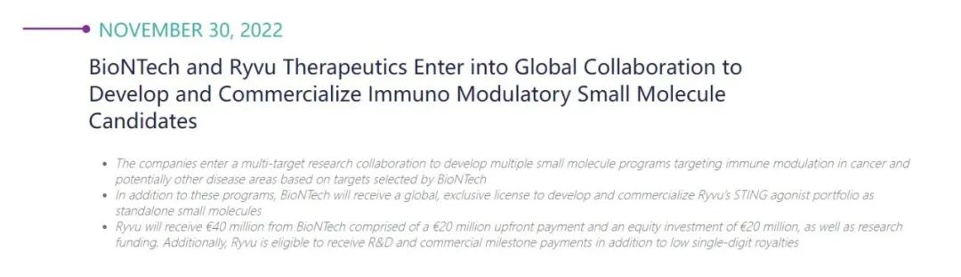 11月30日,BioNTech SE和Ryvu Therapeutics S.A.联合宣布,两家将针对多个小分子免疫治疗项目开展研究合作,并就Ryvu的STING激动剂产品组合签订了独家许可协议。Ryvu 将从BioNTech获得4000万欧元,包括2000万欧元的预付款和2000万欧元的股权投资,以及研究资金。此外,Ryvu 除了低个位数的特许权使用费外,还有资格获得研发和商业里程碑付款。