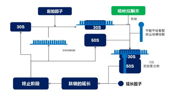 与传统抑制细菌蛋白质合成的药物例如大环内酯类和四环素类不同,噁唑烷酮类不影响肽基转移酶活性,而只是作用于蛋白质合成的起始阶段。这一特殊的作用机制,使噁唑烷酮类不会与其他抗菌药发生交叉耐药现象。