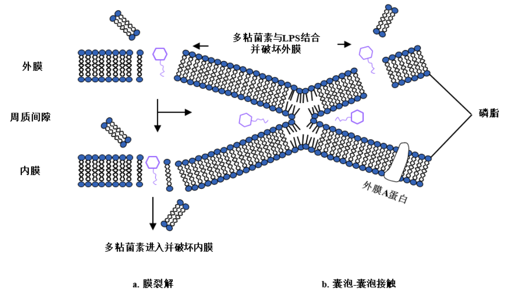 同时,多黏菌素类透过细胞外膜后,可以进一步促进细胞内膜和外膜间脂质的交换,改变磷脂层的专属性,通过这种囊泡接触途径使细菌发生膨胀而发生溶解。此外,多黏菌素类还可能诱发产生活性氧,形成对DNA、脂质、蛋白的氧化破坏导致细菌死亡。