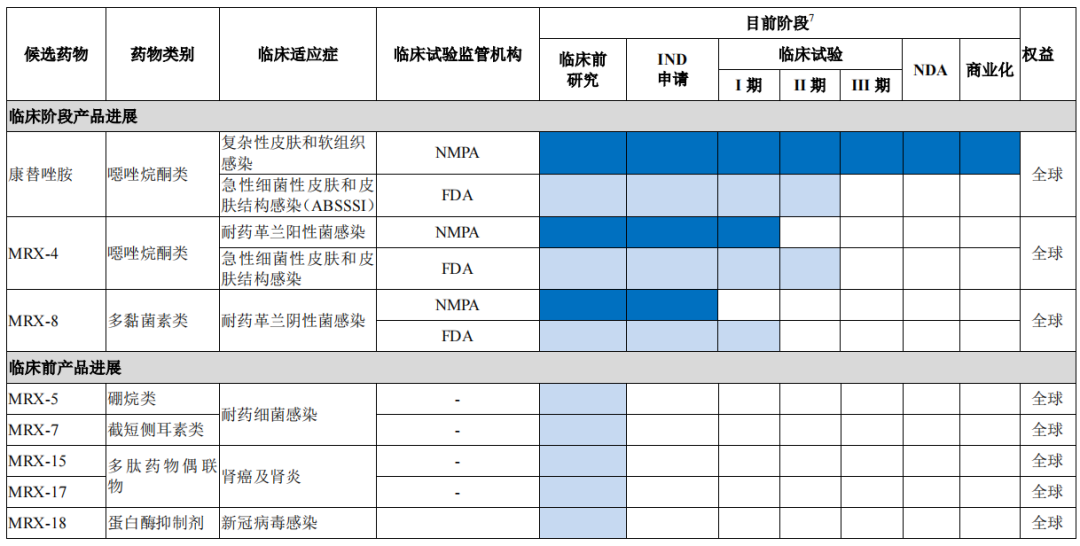 MRX-8为用于治疗多重耐药革兰阴性菌感染药物,现处于美国的I期临床试验阶段,并已申报中国IND申请。MRX-8用于治疗多重耐药革兰阴性菌感染,已于2021年10月提出中国新药临床试验申请。未来公司也将稳步推进MRX-8在治疗多重耐药革兰阴性菌感染方面的临床研究。