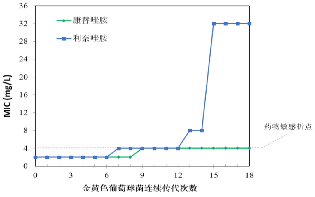 康替唑胺不容易诱发耐药,天然耐药频率低(<8×10-12)。连续传代试验结果显示,经过18代连续诱导,康替唑胺对MSSA依然保持敏感,而利奈唑胺对MSSA的MIC已升高16倍,并在第13代时已产生耐药。试验结果表明,与利奈唑胺相比,金黄色葡萄球菌对康替唑胺产生耐药的趋势明显降低。