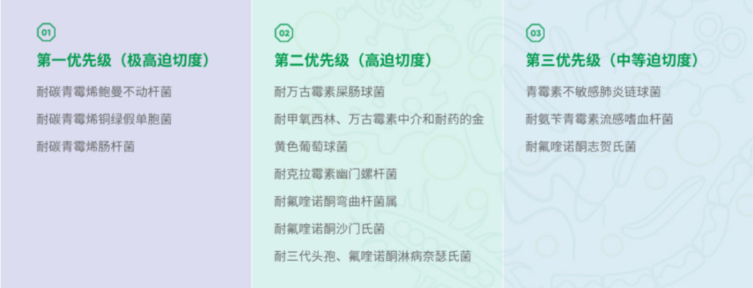 2017年,世界卫生组织发布了一份列有12种多药耐药“超级细菌”的清单,包括三类,第一类为极高迫切度,鲍曼不动杆菌,铜绿假单细胞菌,肠杆菌科位列其中;第二类为高迫切度,如屎肠球菌、金黄色葡萄球菌,幽门螺旋杆菌等;第三类为中等迫切度,含肺炎链球菌,流感嗜血杆菌及志贺氏菌。