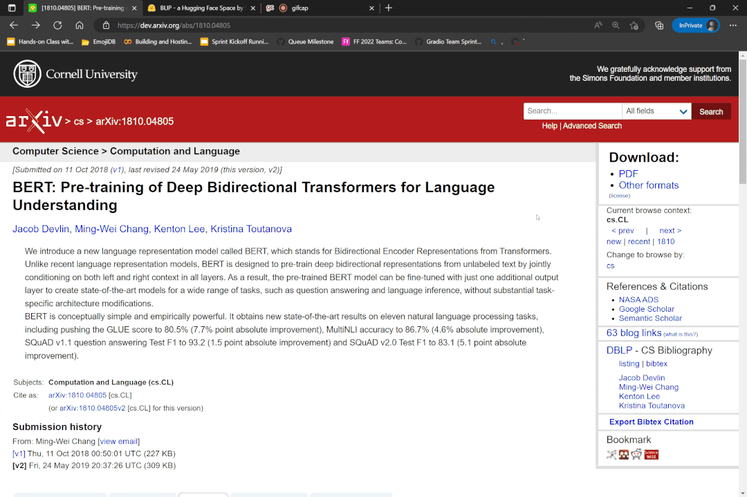 举例来说,如果你想试用 BERT 语言模型的 Demos,可以转到 BERT 论文的 arXiv 页面,然后导航到 Demos 选项卡。这时你将看到开源社区构建的 200 多个 Demos——一些 Demos 只是展示 BERT 模型,而其他 Demos 则展示修改或使用 BERT 作为更大 pipeline 一部分的相关应用程序。