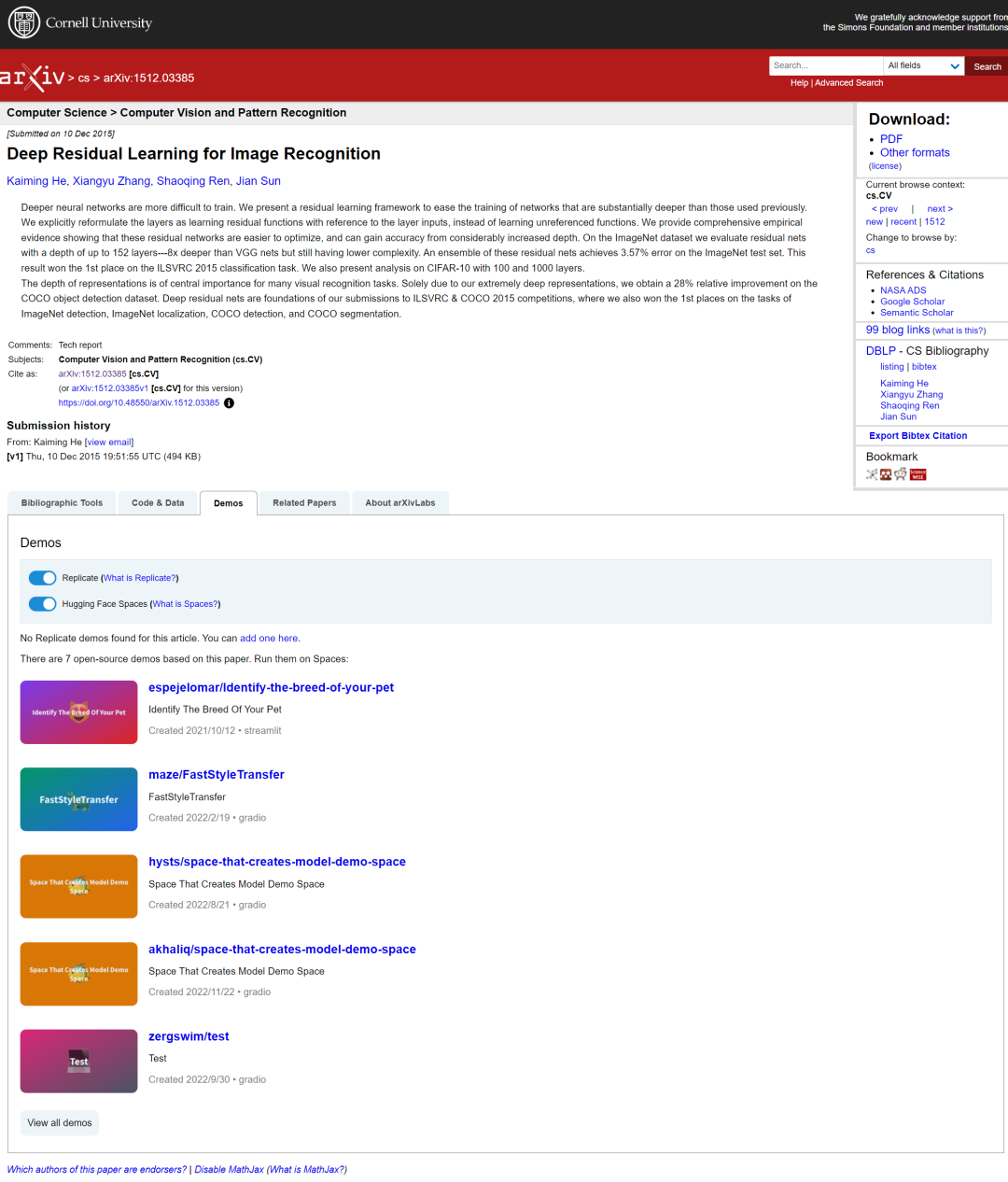 这里,我们也亲自试用了一下,例如在论文《Deep Residual Learning for Image Recognition》的 arXiv 摘要界面,在 Demos 选项卡下有 7 个相关的开源 Demos,用户可以点击相应的链接进入。
