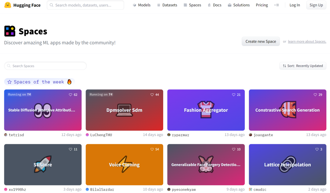 Hugging Face Spaces 是 Hugging Face 于 2021 年 10 月推出的,主要用于构建和共享开源机器学习的 Demos 演示,数量多达 12000 个。借助 Spaces,Hugging Face 用户实现了共享、探索以及对模型的讨论,此外,研究者还构建了交互式应用程序,这样一来使用浏览器的人都可以在不运行代码的情况下进行尝试。这些 Demos 是使用开源工具(如 Gradio 和 Streamlit Python 库)构建的,并利用了 Hugging Face Hub 上的模型和数据集。