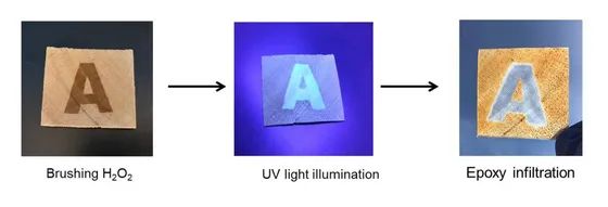 如下图,用刷子蘸取双氧水,在木板上刷出“A”字型,放置在紫外光线下照射一小时,并进一步填充环氧树脂,就可得到镂空“A”字型木板。