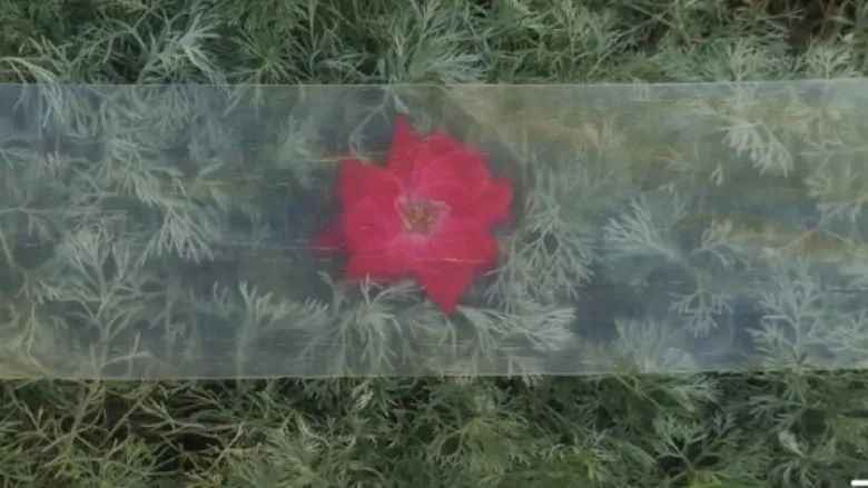 隔着这块板来看下面的花朵,透光度好得让人以为它是玻璃板,但其实是 100% 的木板-树脂复合物。