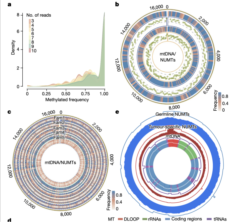 进行验证并检测NUMT的甲基化,展示出线粒体 DNA 仍然在不断转移到细胞核中,从而形成了复杂的 NUMT 环境。超过 99% 的人至少有 1,637 种不同的 NUMT 中的一种。NUMTs 优先涉及非编码线粒体 DNA,将转录和复制与其起源联系起来;核插入涉及多种机制,包括与 PR 结构域锌指蛋白 9 (PRDM9) 结合相关的双链断裂修复,肿瘤特异性 NUMT 的频率因癌症而异,展现出高度异质和动态的人类 NUMT 格局。