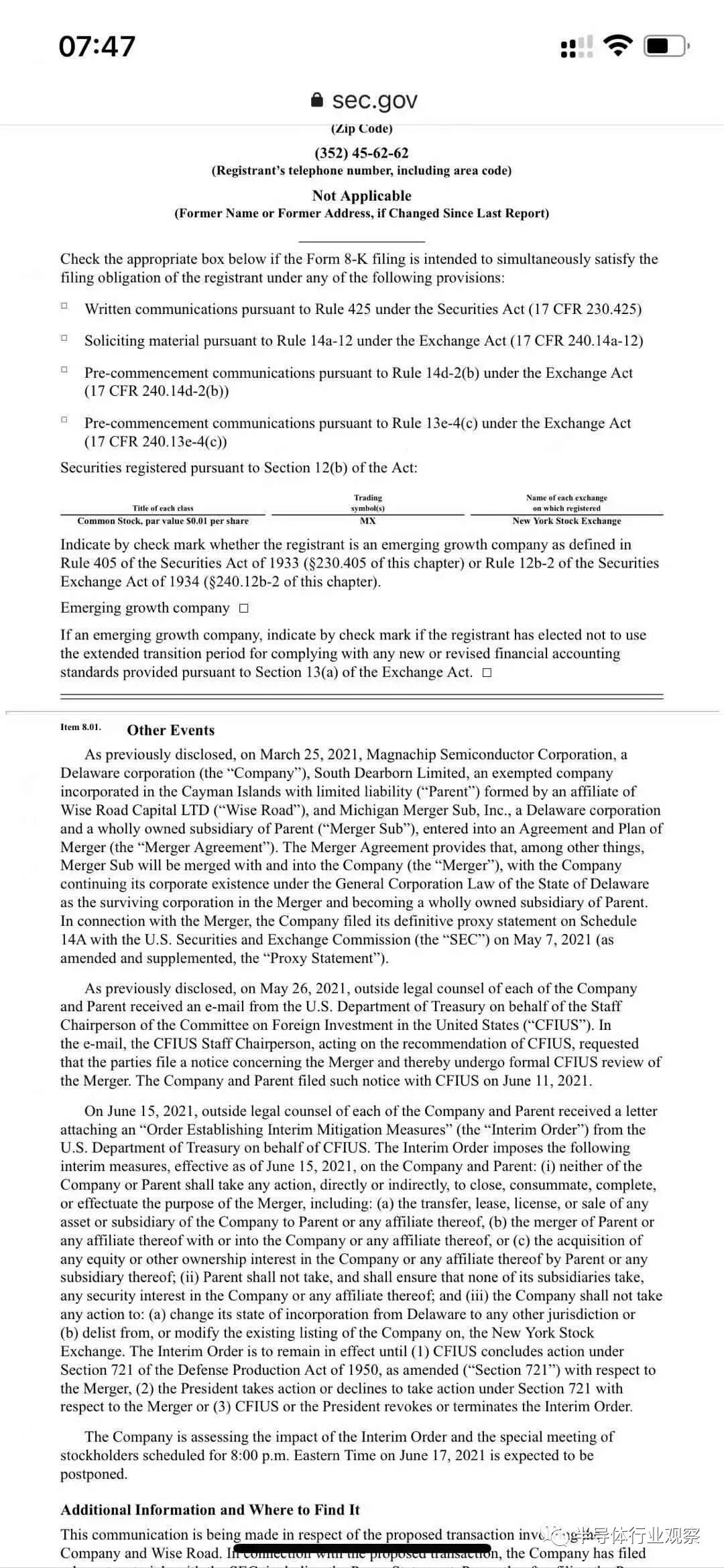2021 年 6 月 15 日,美国财政部代表 CFIUS 向各方发布了“建立临时缓解措施的命令”(“临时命令”),对各方施加暂停要求,直到 CFIUS 批准交易,总统拒绝采取行动,或总统撤销或终止临时命令。” (Magnachip Semiconductor Corporation 表格 8-K,2021 年 6 月 16 日,美国证券交易委员会备案。)