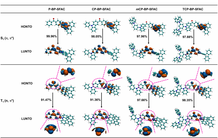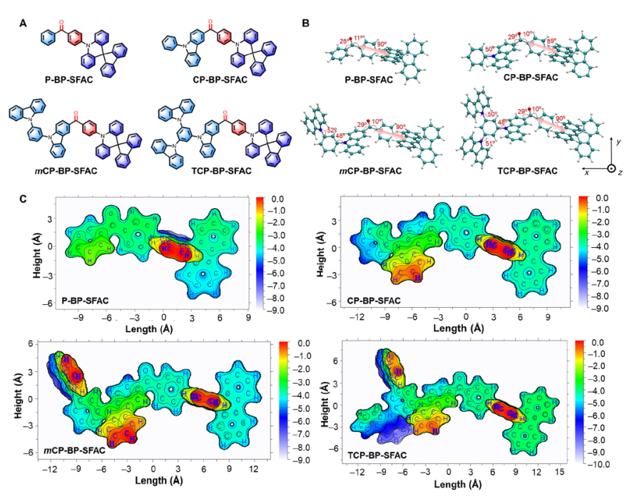 在这些分子中,羰基和螺吖啶通过苯基桥形成一个扭曲的 D-A 分子骨架,主导天蓝色延迟荧光的产生。由于 n-π* 跃迁的存在,羰基核有利于增强自旋轨道耦合效应(SOC,spin-orbit coupling)和反向系间窜越(RISC, reverse intersystem crossing)过程,从而促进延迟荧光的产生,提高激子利用率。