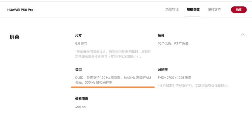 图 | HUAWEI P50 Pro 屏幕参数(来源:consumer.huawei.com)