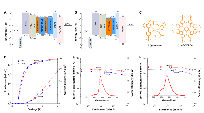 在研究中,该团队还实现了最先进的非掺杂杂化白光 OLED、以及全荧光单发射层白光 OLED,佐证了这些分子的产业潜力。