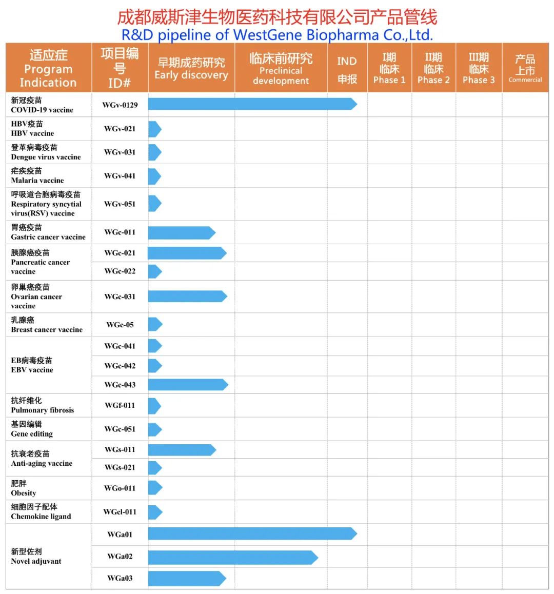 目前,威斯津生物的mRNA药物产品管线拥有包括抗感染疫苗、肿瘤疫苗、抗衰老疫苗、肥胖治疗、肺纤维化治疗、基因编辑治疗罕见病/遗传病、新型佐剂(鼻用、肌注)在内的近20个mRNA药物和疫苗佐剂品种以及和新型佐剂等,已在成都天府国际生物城建立了mRNA药物的生产车间。