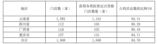 报告期末,公司直营门店中已取得各类“医疗保险定点零售药店”资格的药店达 1668 家,占药店总数 84.76%,公司开通各类慢病医保支付门店 176 家。