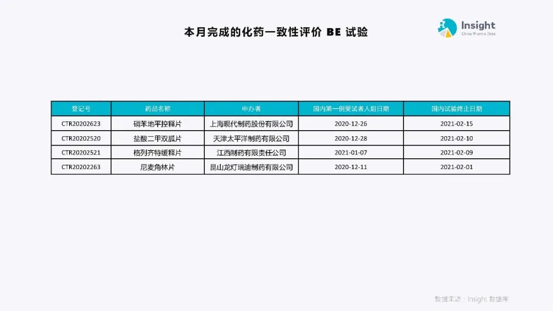 2021 年 2 月 1 日 - 2 月 28 日,在 CDE 公示的临床试验中,有 4 个登记号完成了一致性评价 BE 试验。