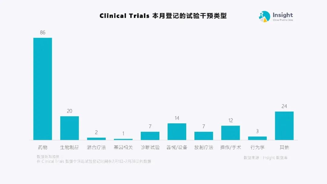 ClinicalTrials 试验登记日期在 2021 年 2 月 1 日-2 月 28 日,试验范围在中国的共有 158 个,干预类型的试验分布如下: