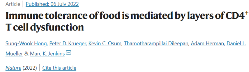Sung-Wook Hong et al. Immune tolerance of food is mediated by layers of CD4+ T cell dysfunction. Nature, 2022, doi:10.1038/s41586-022-04916-6.