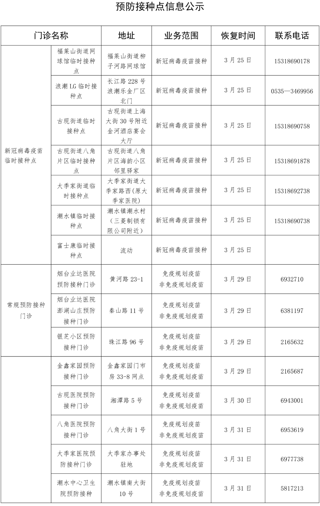 随着烟台市疫情防控实现社会面“动态清零”,为保障市民身体健康,开发区将有序恢复包括新冠病毒疫苗接种在内的各种预防接种服务。各接种点详细信息详见附表,广大市民朋友可前往接种。