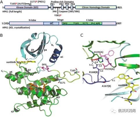 HPK1 由N 端的ste20样激酶结构域、4 个富含脯氨酸基序,分别为P1、P2、P3 和P4 的中心结构域和远端Citron同源结构域组成。
