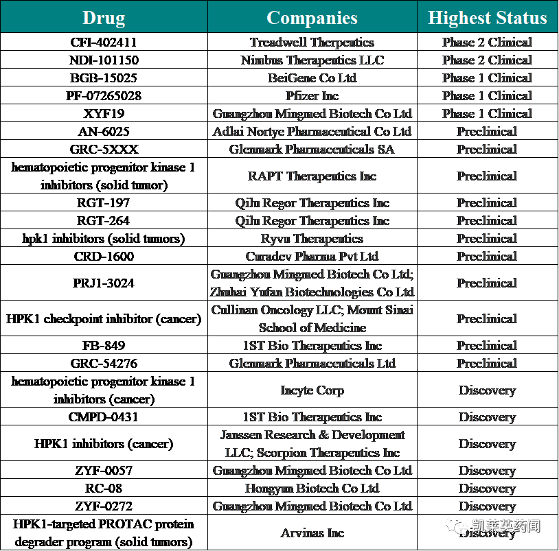 1、据不完全统计,由于家族成员结构相似,拮抗剂的研发并不完全安全,PROTAC研发同样也是困难重重, 基因编辑技术在临床上大展拳脚也还有段路要走。目前在研的HPK1抑制剂共20余种,多数处于临床前及药物发现阶段,仅5种药物进入临床。