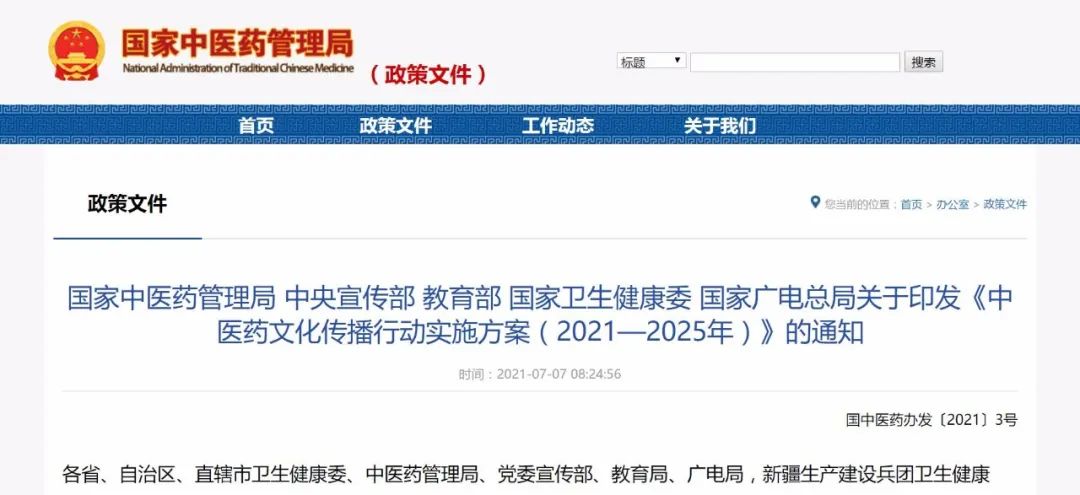 7月7日,国家中医药管理局、中央宣传部、教育部、国家卫生健康委、国家广电总局联合印发《中医药文化传播行动实施方案(2021—2025年)》,部署推动“十四五”时期中医药文化传承弘扬工作。