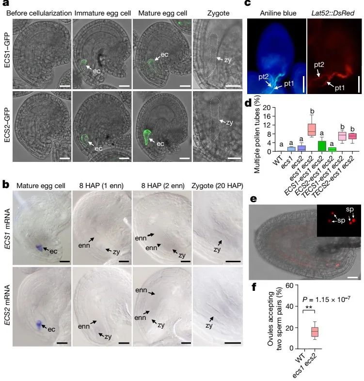 课题组同时揭示了卵细胞可以感知受精成功,只有在受精成功时卵细胞才会释放ECS,阻止多余花粉管进入,进而明确回答了为什么在受精不成功情况下花粉管仍可以进入胚囊,而受精成功后又可迅速阻止多余精细胞进入胚囊的疑问。