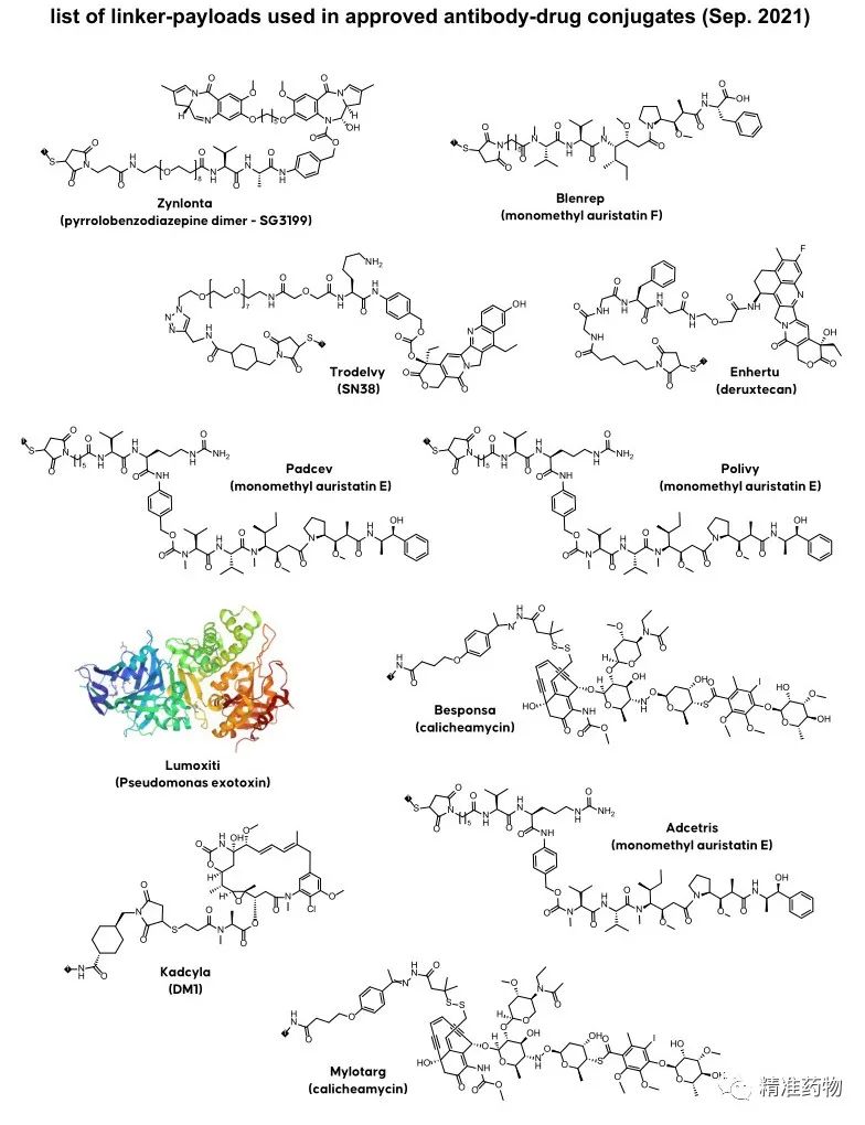 Drughunter汇总了FDA批准的ADC药物及其靶点和一些代表性弹头的结构(下图):