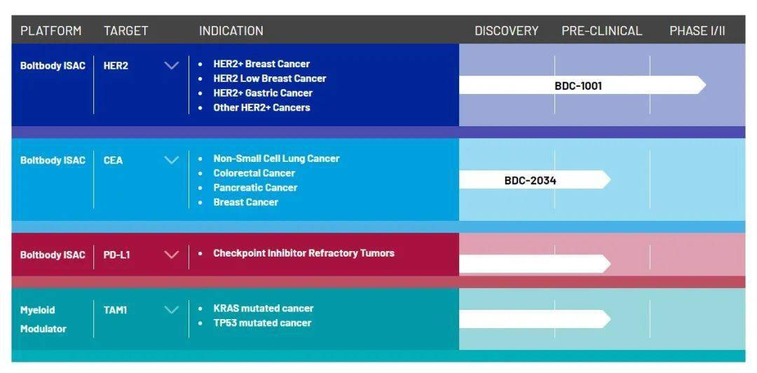 从Bolt公布的在研管线来看,除BDC-1001外,Bolt还在同步推进 BDC-2034,一款抗癌胚抗原 (CEA) 的 ISAC,以及其他免疫肿瘤治疗管线。