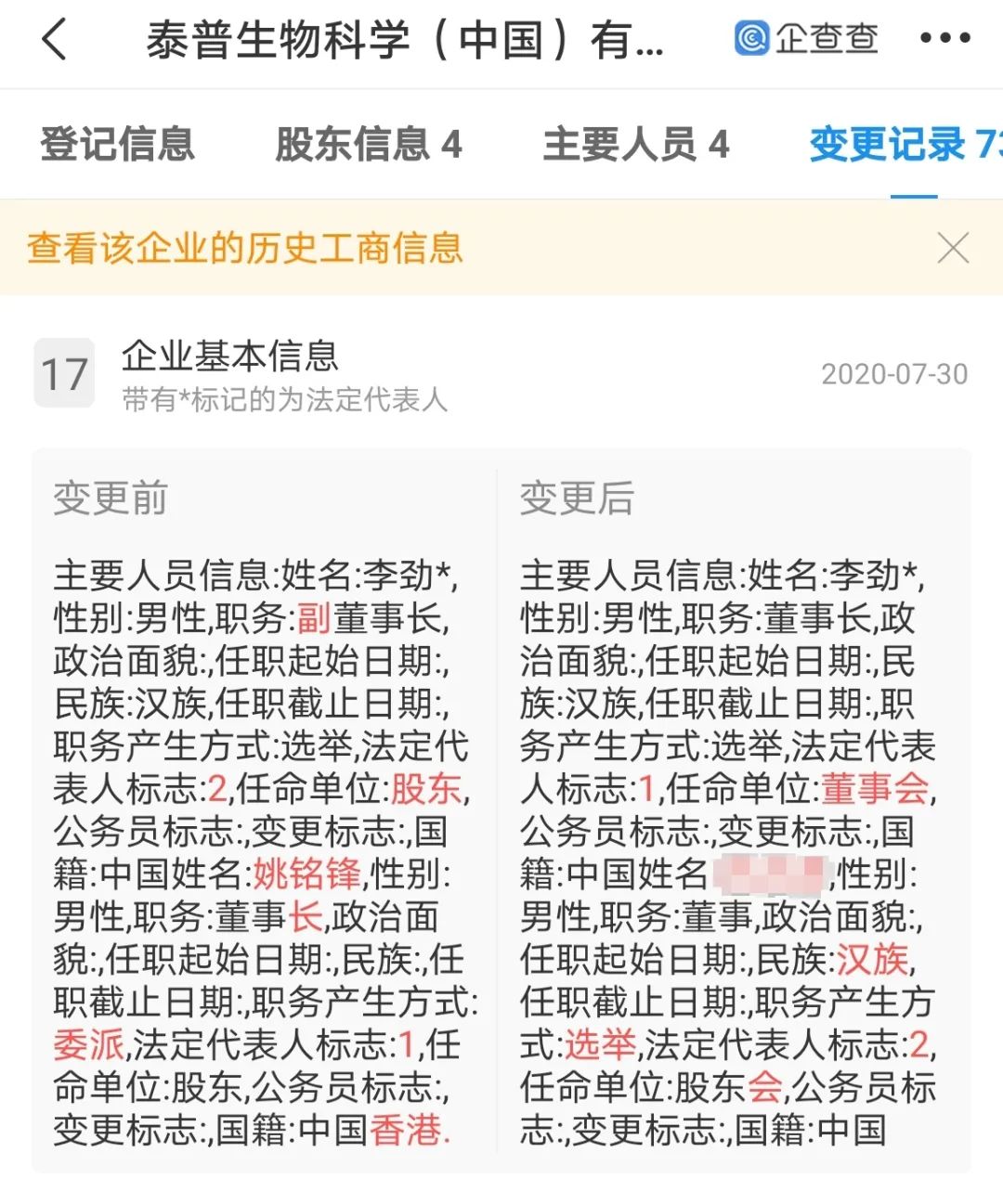 根据企查查等公开信息查询可知,姚铭峰原为泰普生物科学(中国)有限公司的法人代表,2020年8月才变更为他人。在变更之前,根据企查查等公开信息查询可知,该企业涉诉案件已达到了17件之多,涉案金额已逾几千万。