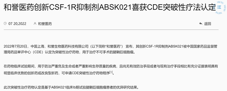 7月20日,和誉医药公告宣布其创新CSF-1R抑制剂ABSK021被CDE认定为突破性治疗药物,用于治疗不可手术的腱鞘巨细胞瘤(TGCT)。