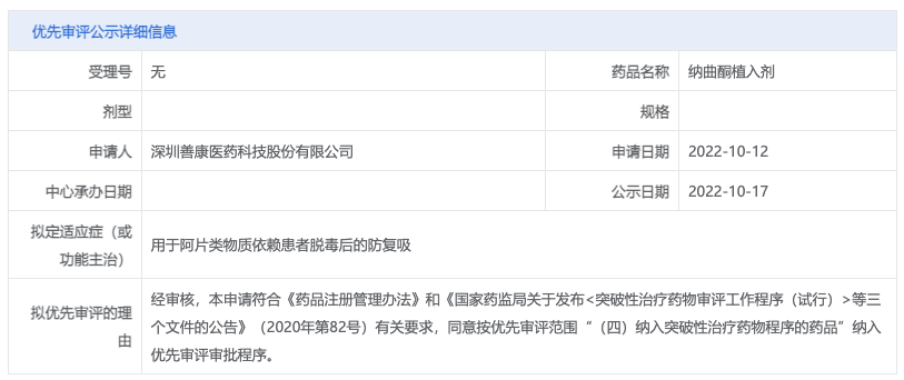 善康医疗「纳曲酮植入剂」拟纳入优先审评