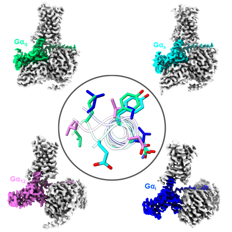 同时,该项研究首次对同一个受体上的4种主要的G蛋白的偶联方式进行了详细的比较。结构比较发现G蛋白的偶联的专一性主要有Gα亚基的C端第5螺旋