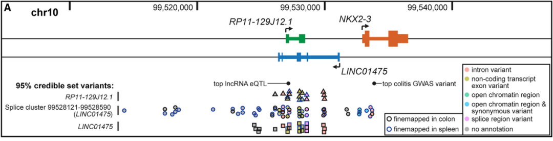 作为lncRNA介导的疾病示例,他们重点介绍了lncRNA基因LINC01475(ENSG00000257582)和RP11-129J12.1(ENSG00000228778)与溃疡性结肠炎之间的共定位。这两个基因在相反的DNA链上重叠,位于蛋白质编码基因NKX2-3的上游(图1)。这两个 lncRNA基因共定位的组织(包括肠道组织、脾脏和小唾液腺)与溃疡性结肠炎有关。在克罗恩氏病的全基因组关联分析中也观察到了与这两种lncRNA的共定位,表明这两种与溃疡性结肠炎和克罗恩氏病有关。