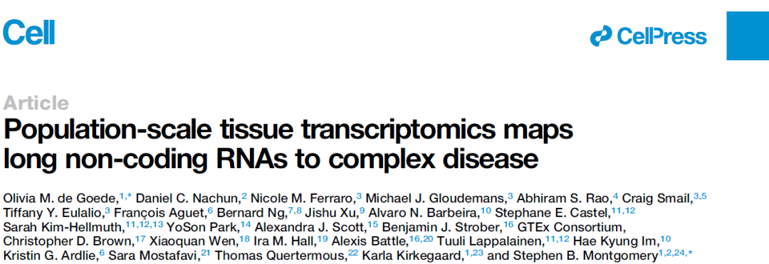 2021年4月16日,来自斯坦福大学Stephen B. Montgomery的研究团队在Cell上发表了题为Population-scale tissue transcriptomics maps long non-coding RNAs to complex disease的论文。文章探究了lncRNA与人类疾病的关系。研究者使用了来自基因型-组织表达 (Genotype Tissue Expression,GTEx) 项目v8的数据,分析了来自49种组织中14,100个lncRNA基因的表达,遗传调控和细胞环境,确定了1,432个lncRNA基因-性状关联,揭示了lncRNA与人类疾病之间的联系。