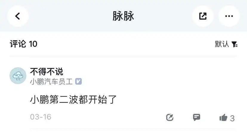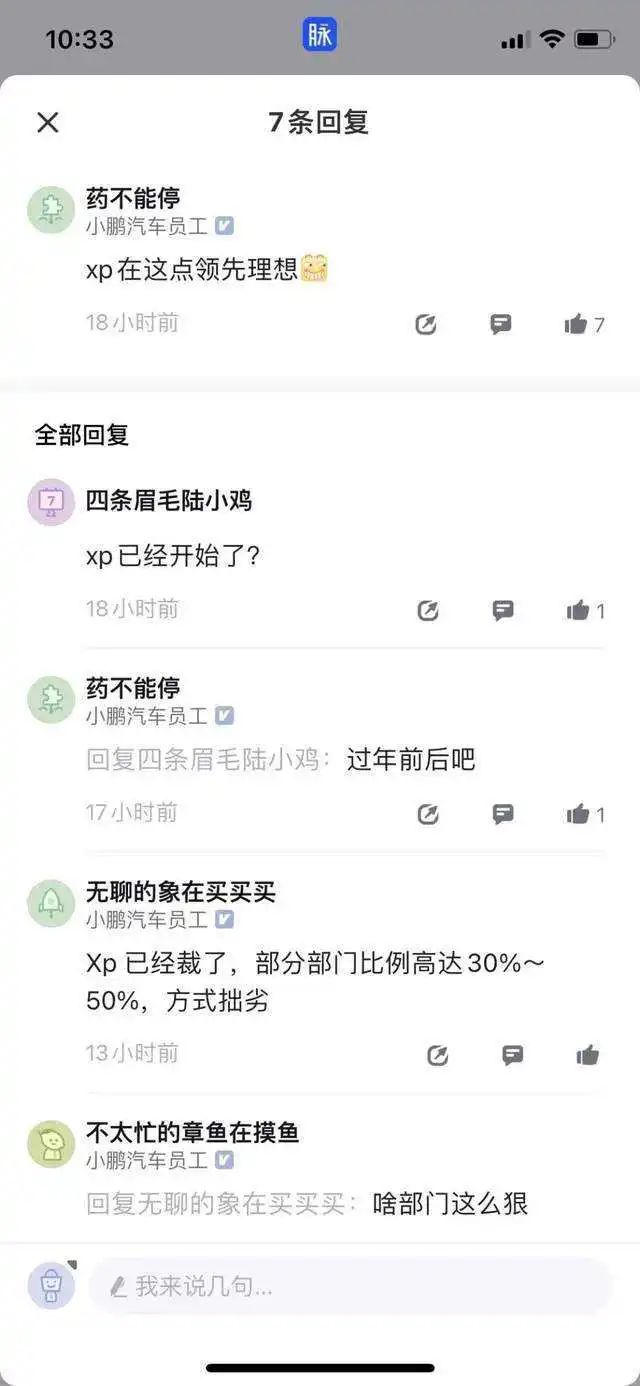 在脉脉的同一话题内,除了理想汽车,小鹏也被爆出裁员的消息,有小鹏汽车员工在话题下表示,年后小鹏已经进行了两轮裁员。