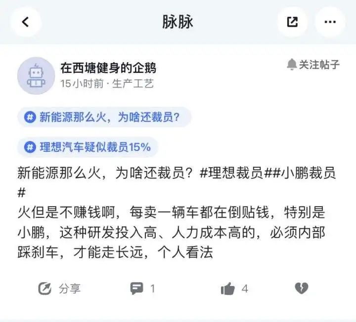 有脉脉网友认为:目前,造车新势力仍处于烧钱阶段,每卖一辆车都是在倒贴钱,高昂的研发费用和人力成本必须「内部刹车」。
