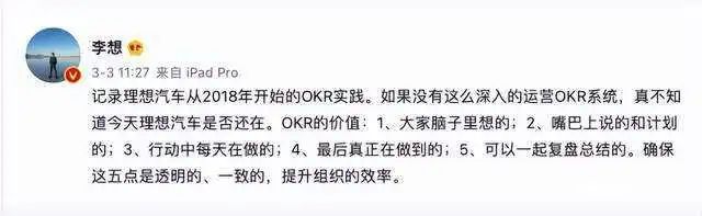 2022年3月初,理想汽车的老板李想发布一条微博,夸赞理想汽车的OKR系统成就。