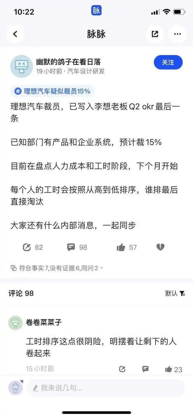 近日,有网友在职场社交软件脉脉上爆料:理想汽车将在2022年第二季度裁员15%,采用末位淘汰制度。