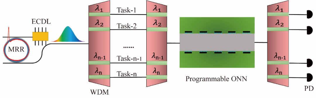该高维光学神经网络系统中,以微腔孤子光梳为光源,其具有高重复频率的特性,天然地避免了不同波长中的信息串扰。来自该光源的众多波长,可成为波分复用技术中携带信息的载体,显著增大信号传输的容量,提高光子计算芯片处理信息的速度。