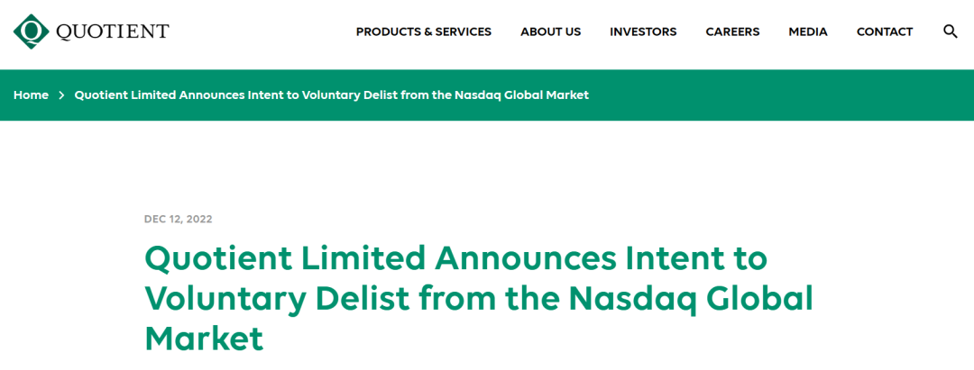 纽约 - Quotient Limited周一表示,将于12月27日或前后从纳斯达克全球市场申请将其股票退市。