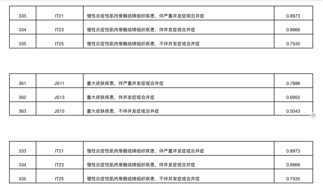 某市公布的2022年医保DRG付费权重明细表显示,涉及风湿科常见疾病的分组,权重普遍在1以下。