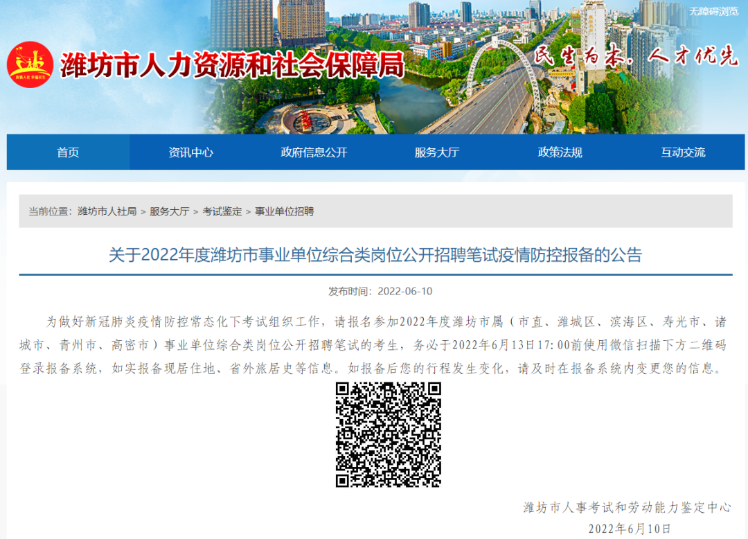 为做好新冠肺炎疫情防控常态化下考试组织工作,请报名参加2022年度潍坊市属(市直、潍城区、滨海区、寿光市、诸城市、青州市、高密市)事业单位综合类岗位公开招聘笔试的考生,务必于2022年6月13日17:00前使用微信扫描下方二维码登录报备系统,如实报备现居住地、省外旅居史等信息。如报备后您的行程发生变化,请及时在报备系统内变更您的信息。