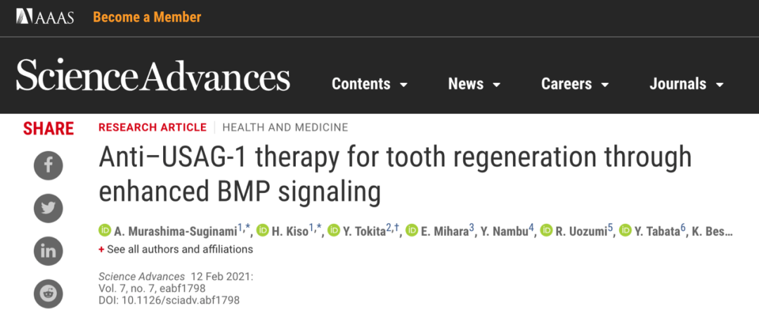 A. Murashima-Suginami et al. Anti–USAG-1 therapy for tooth regeneration through enhanced BMP signaling. Science Advances, 2021, doi:10.1126/sciadv.abf1798.