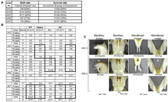 此外,这些作者成功地获得了USAG-1中和抗体,即使在野生型小鼠中,这些中和抗体也有潜力让它们产生全新的牙齿。这些小鼠的表型变化与USAG-1基因敲除小鼠的表型变化相似,这说明这些中和抗体可能会拯救USAG-1缺失小鼠的牙原基(rudimental tooth primordia)。