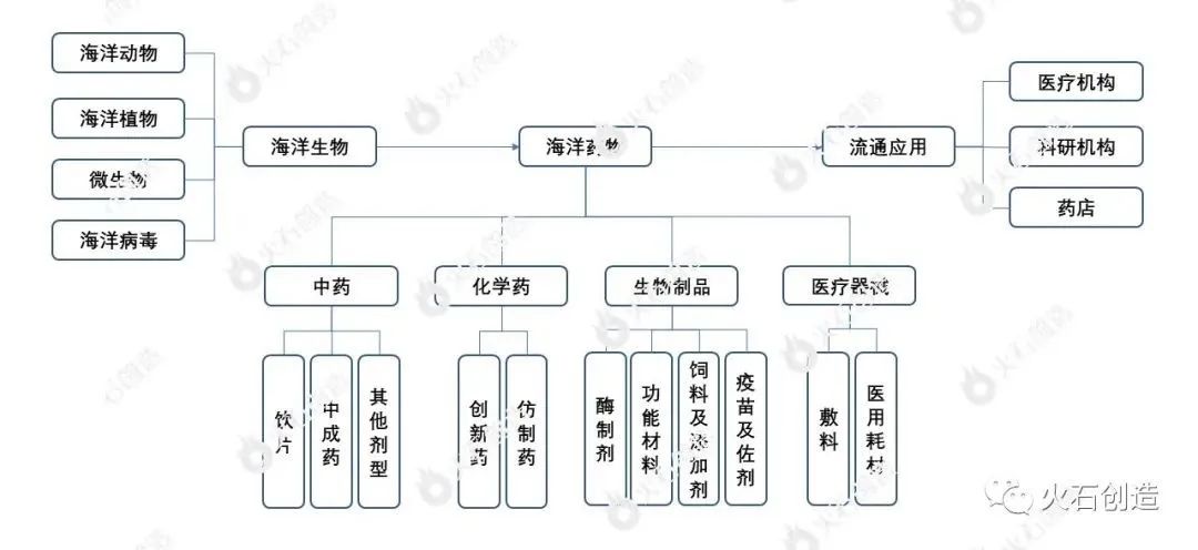 海洋生物医药产业链的上游为海洋生物原料,包括海洋动物、海洋植物、微生物和海洋病毒;中游为海洋生物医药制造,通过对海洋生物进行炮制,或在海洋生物中提前有效成分再进行合成等,制备成各类药品或材料,主要包括中药、化学药、生物制品、医疗器械;下游为海洋生物医药的流通和应用。