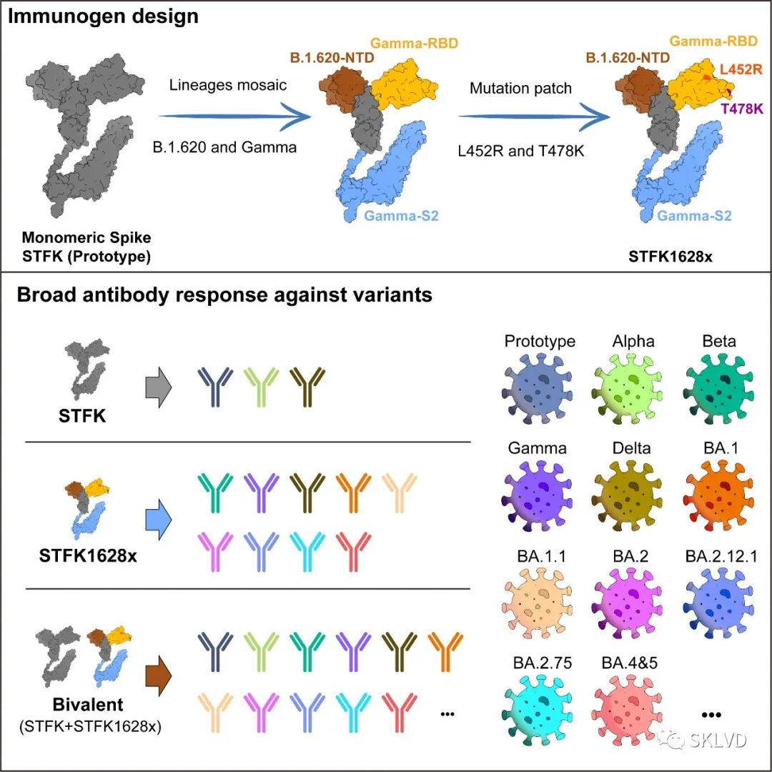 发展广谱新冠疫苗最关键的难题是如何构建出能够诱导广谱保护的免疫原。为此,我室夏宁邵教授团队提出了一种“谱系嵌合-突变补丁”的免疫原构建策略,即通过对抗原性差异大的毒株进行S蛋白的结构域嵌合重组和突变改造,评价筛选出免疫原性强、抗原性互补程度高的免疫原组合,实现更广谱的抗原性覆盖。在该研究中,研究人员将B.1.620变异株S蛋白的N端结构域(NTD)与Gamma变异株的受体结合域和S2亚基(RBD-S2)嵌合重组,并在此基础上引入其他影响抗原性的RBD突变,成功构建了免疫原性强、抗原性与原型S蛋白(STFK)互补的嵌合免疫原STFK1628x及STFK1628y。其中,由STFK和STFK1628x组成的二价疫苗在动物中诱导了高滴度的广谱中和抗体,能有效地中和各类VOC和VOI变异株,包括Omicron BA.1、BA.1.1、BA.2、BA.2.12.1、BA.2.75、BA.4和BA.5。在仓鼠攻毒模型中,证实该疫苗能够高效保护新冠原型株和Beta、Omicron变异株的直接攻击。更重要的是,该研究还表明该二价疫苗可以阻断病毒从接种过疫苗的仓鼠传播到未接种过疫苗的个体。值得一提的是,两种新的免疫原STFK1628x及STFK1628y均是在Omicron出现之前设计构建的,却能高效诱导针对Omicron各种变异株的广谱中和抗体,表明该研究提出的免疫原构建新策略具有前瞻性。这些研究结果阐明了新冠变异株S蛋白的抗原性和免疫原性特征,可为开发COVID-19通用疫苗提供新思路。