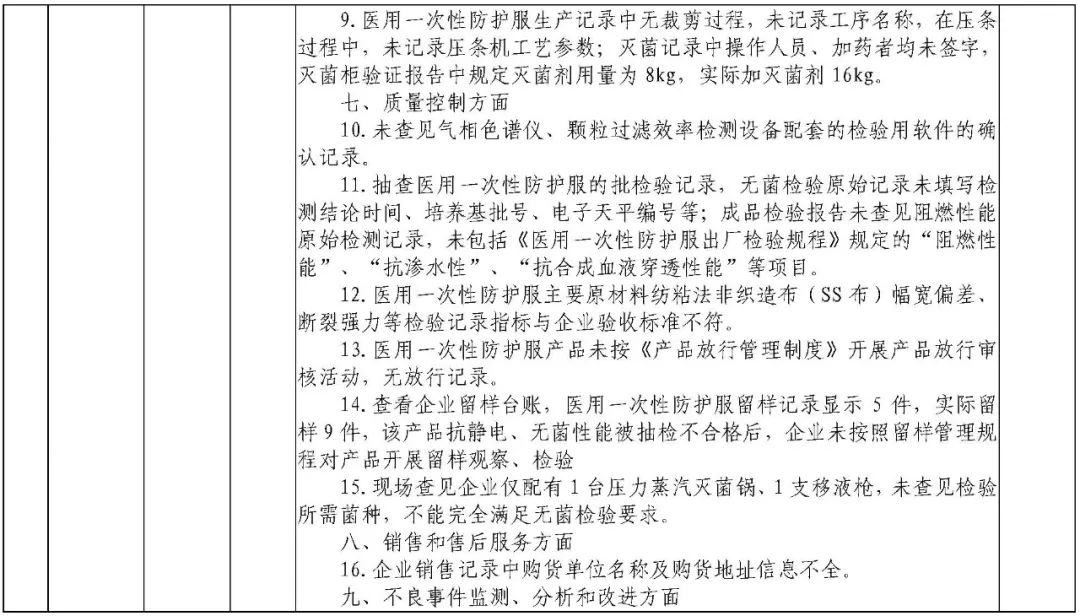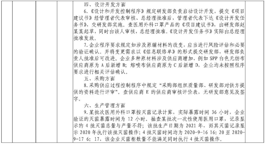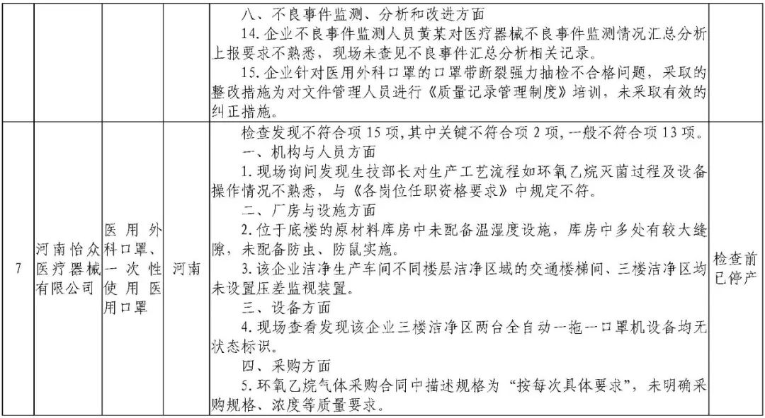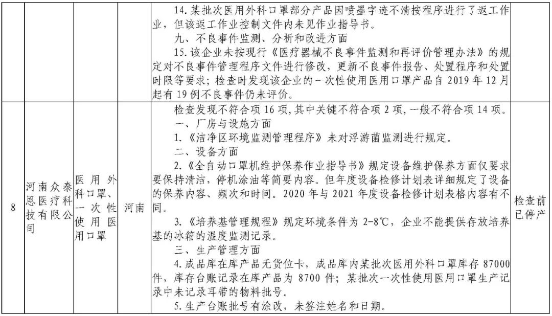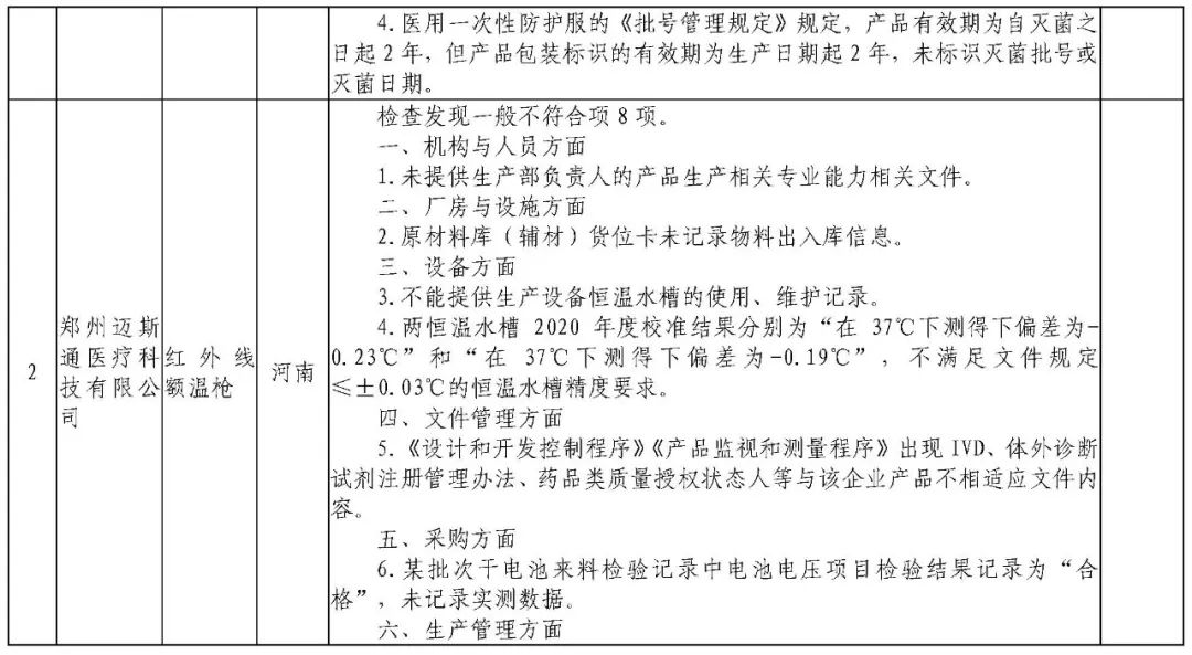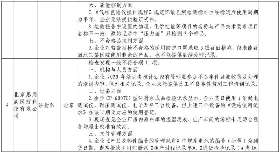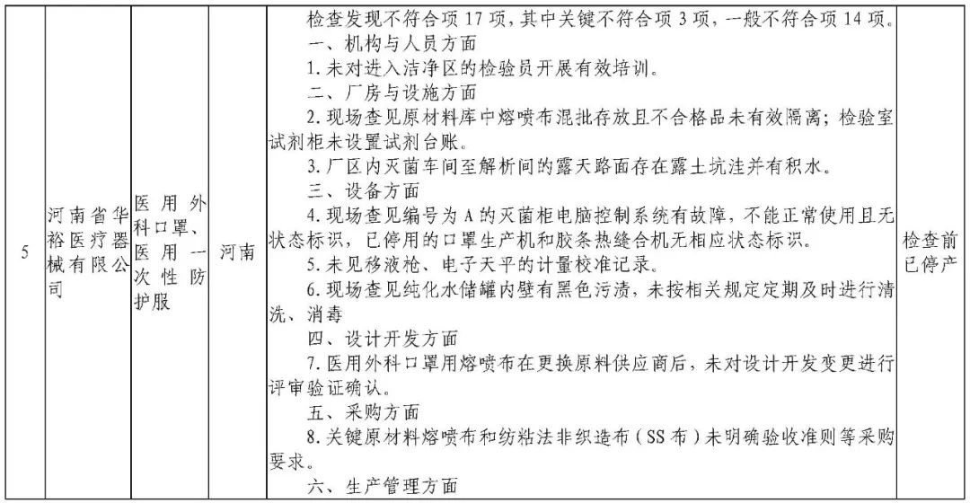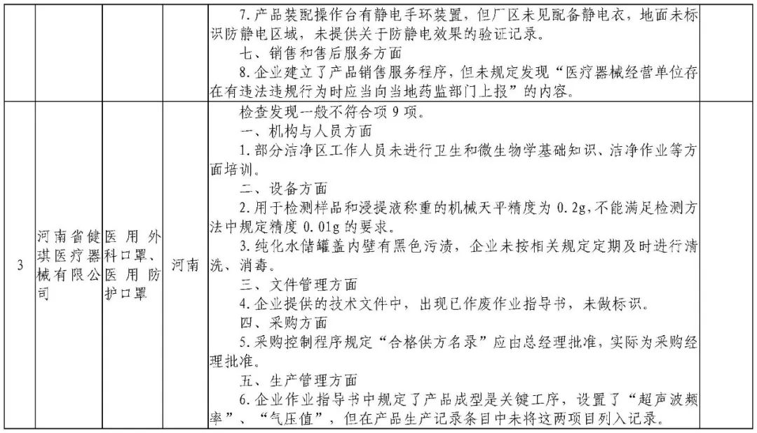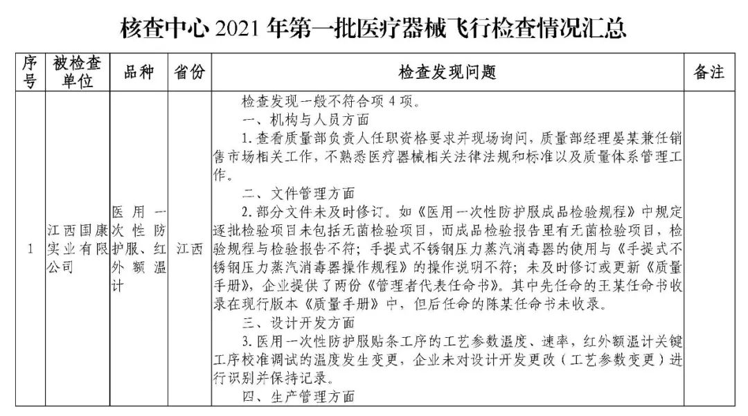 为加强医疗器械监督管理,保障医疗器械安全有效,依据《医疗器械监督管理条例》《医疗器械生产监督管理办法》《药品医疗器械飞行检查办法》《医疗器械生产质量管理规范》及相关附录,以及《食品药品监管总局关于印发医疗器械生产质量管理规范现场检查指导原则等4个指导原则的通知》(食药监械监〔2015〕218号)等要求,按照国家药品监督管理局2021年医疗器械检查工作部署,核查中心于2021年3月组织开展了医疗器械生产企业飞行检查工作,发现江西国康实业有限公司等4家企业存在一般项目不符合《医疗器械生产质量管理规范》及相关附录要求;河南省华裕医疗器械有限公司等4家企业(检查前已停产)存在关键项目不符合《医疗器械生产质量管理规范》及相关附录要求。具体情况见附表。