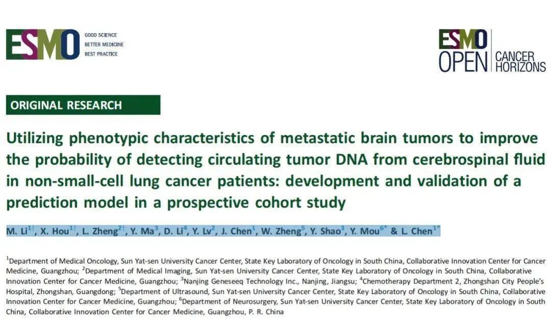 近日,由中山大学肿瘤防治中心内科 陈丽昆教授和神经外科 牟永告教授团队开展了一项前瞻性研究, 首次揭示了NSCLC脑转移患者的临床特征和颅内影像学特征与CSF ctDNA检出之间的关系,并建立了可预测CSF ctDNA检出率的多元模型,用于CSF ctDNA检测优势人群筛选。相关成果近期发表于ESMO Open杂志(IF=6.54),文章题目为Utilizing phenotypic characteristics of metastatic brain tumors to improve the probability of detecting circulating tumor DNA from cerebrospinal fluid in non-small-cell lung cancer patients: development and validation of a prediction model in a prospective cohort study。