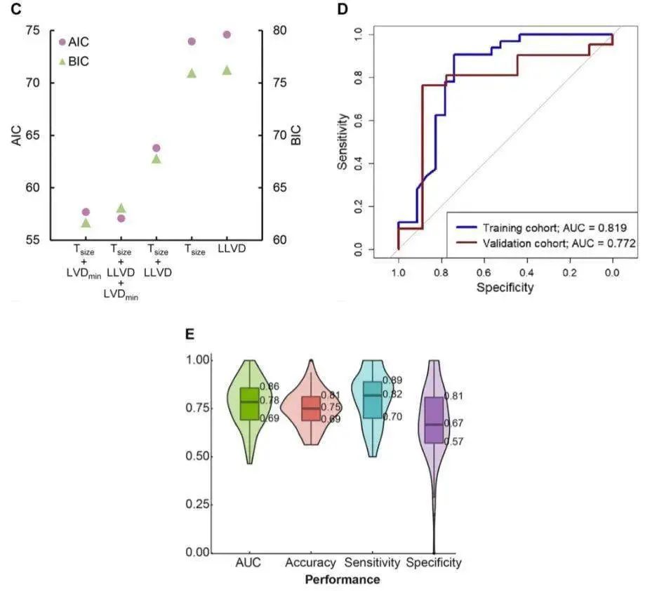 研究进一步纳入所有影响因素,通过全子集回归建模,分别采用赤池信息准则(AIC)和贝叶斯信息准则(BIC)检验模型性能。结果显示,纳入Tsize和LVDmin并使用BIC法预测效果最好(图2C)。在训练队列中预测CSF ctDNA检出阳性模型的AUC为0.819,准确性为0.800、敏感性为0.844,特异性为0.739;在独立的外部队列中验证该模型,AUC为0.772,准确性为0.767,敏感性为0.809,特异性为0.600(图2D)。基于Tsize和LVDmin两个变量,在训练集内部随机分组(按照7:3,重复100次)交叉验证,平均AUC达到0.78,平均准确性达到0.75(图2E)。以上方法均表明基于Tsize和LVDmin构建的多元预测模型具有稳定可靠的预测性能。