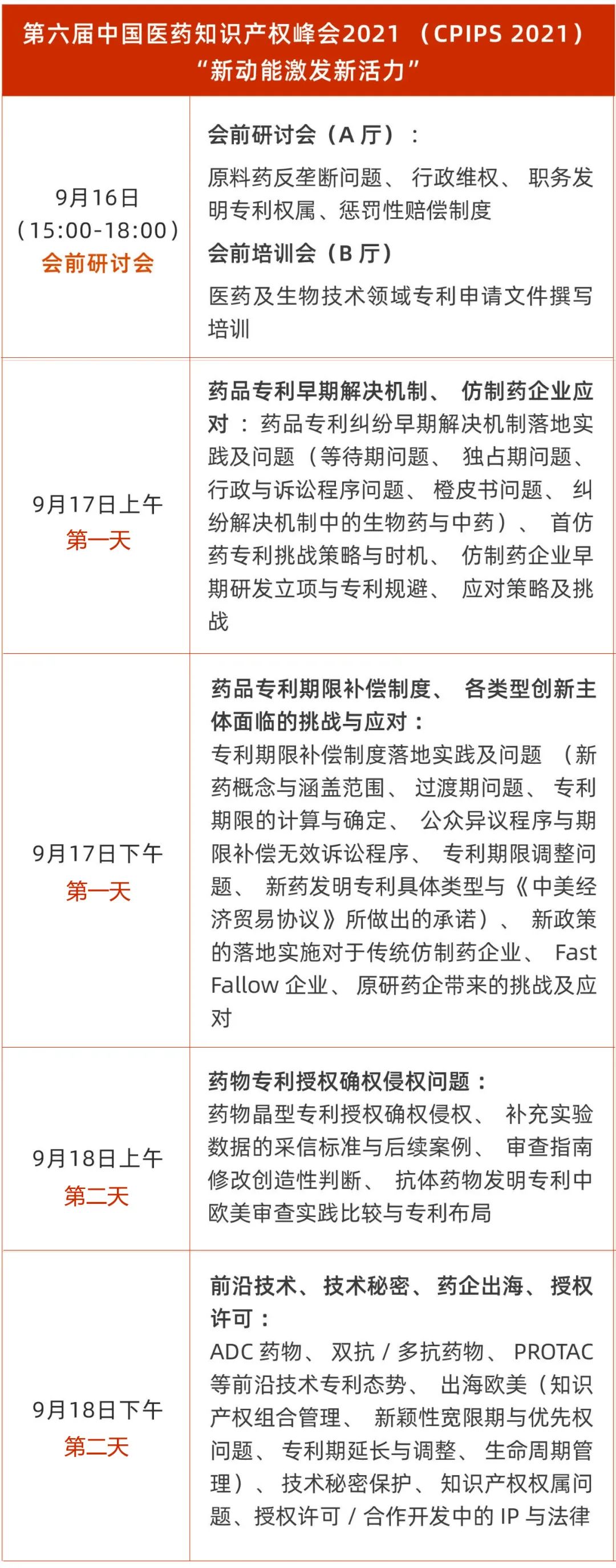 然而业内就药品专利纠纷早期解决机制、专利期限补偿及审查指南的修改与落地实践还有诸多争议,对于我国不同创新主体而言机遇与挑战并存。在此背景下由YIP Events & 知产前沿新媒体主办的“第六届中国医药知识产权峰会”将以“知识产权保护新动能激发医药创新新活力”为主题于2021年9月16-18号在北京召开。两天的大会及半天的会前研讨会将主要围绕药品专利纠纷早期解决机制及专利期补偿制度后续落地后的实践及存在的问题、专利授权确权侵权、新制度新挑战、转型升级、前沿技术专利态势、药企出海生命周期管理及授权许可、合作开发中IP与法律问题展开讨论。大会旨在为医药知识产权从业人员搭建学术交流与合作平台,促进我国医药产业创新发展。